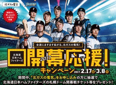 北海道ガス株式会社と北海道日本ハムファイターズは昨年に引き続き、「北ガスの電気」をお申し込みいただいたお客さまを対象に、開幕シリーズの花束贈呈権付観戦チケットなどが当たる<北海道日本ハムファイターズ開幕応援!キャンペーン>を3月8日(水)まで実施しております。キャンペーン締切間近となっておりますので、この機会にぜひ「北ガスの電気」への切り替えをご検討ください。