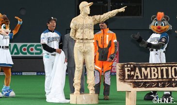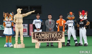 3月5日(日)のオープン戦・読売ジャイアンツ戦(札幌ドーム)開始に先立ち、北海道下川町で制作された2017年チームスローガン「F-AMBTIOUS」の木彫作品が北海道日本ハムファイターズに寄贈されました。スローガンと芸術作品とのコラボレートは2月に札幌市豊平区で英国人スノーアーティスト、サイモン・ベック氏が雪上に描いたものに続く第2弾。この日は谷一之下川町長と制作者の児玉光さんがご来場され、栗山英樹監督へ「F-AMBITIOUS」のロゴと左手を上げた監督の等身大彫刻が贈られました。