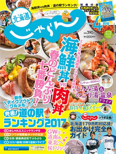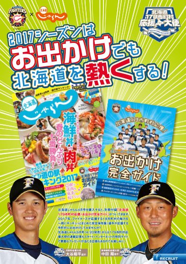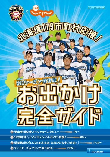 北海道日本ハムファイターズと株式会社リクルート北海道じゃらんは、このたび新たに<北海道179市町村応援大使2017>の18市町村の魅力、自慢のグルメ・温泉・名物スポットなど各地のイイトコ、イイモノをたっぷり掲載し、そのマチを応援していく「179市町村応援大使2017お出かけ完全ガイド」を共同制作、179市町村応援大使×北海道じゃらんコラボ企画として3月20日(月・祝)発売の「北海道じゃらん」4月号の特別冊子からスタートいたします。