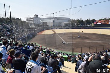北海道日本ハムファイターズのファーム本拠地、ファイターズ鎌ケ谷スタジアムが開場20周年を迎えました。イースタン・リーグのホーム初戦となった3月20日(月・祝)の読売ジャイアンツ戦を「いざ鎌スタ!20周年開幕戦」と銘打って開催。4,425人の大観衆でスタンドが埋め尽くされ、大声援の後押しを受けたファイターズは10-5で今シーズンの初勝利を挙げました。