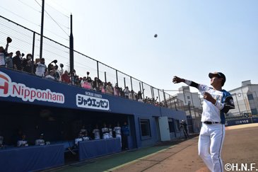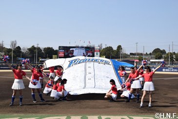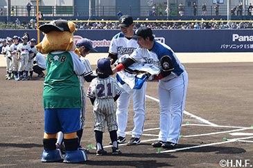 ファイターズ鎌ケ谷スタジアムは故・大社義規元オーナーが情熱を注ぎ完成させた施設で、1997年に川崎市の多摩川グラウンドから移転。恵まれた練習環境に「スカウティングと育成」を標榜するチーム方針のもと、1軍の優勝に貢献する主力選手が次々とここから誕生してきました。試合前セレモニーでは20年の歩みを紹介するVTRを上映したほか、ファンの皆様のメッセージが書き込まれたビッグフラッグユニフォームの贈呈があり、ご来賓の清水聖士鎌ケ谷市長からは「ファイターズとともにこれからも発展してまいりたい」とご挨拶をいただきました。
