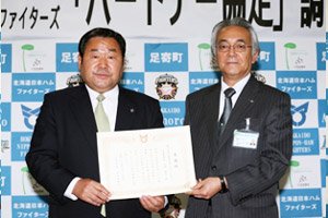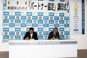 2014年に飯山裕志選手と中島卓也選手が応援大使に就任したことを契機にファイターズ足寄後援会が発足、以後も野球教室を中心に交流深めてきました。ご出席された足寄町の安久津勝彦町長は「昨年8月の台風上陸で町政史上まれにみる災害に見舞われた際、ファイターズの野球中継で勇気と元気を与えられました。改めてスポーツ、野球の持つ力を再認識しました。様々な分野で協力し、町の活性化につなげられたら」と述べられました。竹田憲宗社長も「足寄牛にラワンブキ、カラマツなど魅力ある資源のPR、食育講座や指導員研修会の開催を提案しながら、この協定がお役に立てるよう尽くしてまいります」と話しました。