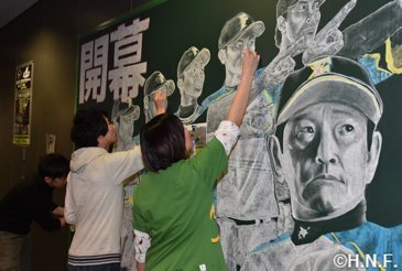 作品は3月31日(金)開幕戦の試合前に、札幌ドームにてお披露目され4月2日(日)まで札幌ドーム1階コンコースに展示されています。チョークアートの制作に取り組んでくださったのは江別市の大学生3名、3日間かけてタテ2m・ヨコ6mという大作を見事完成してくれました。