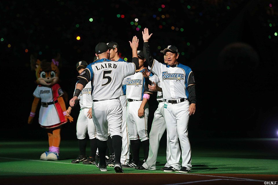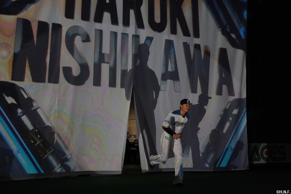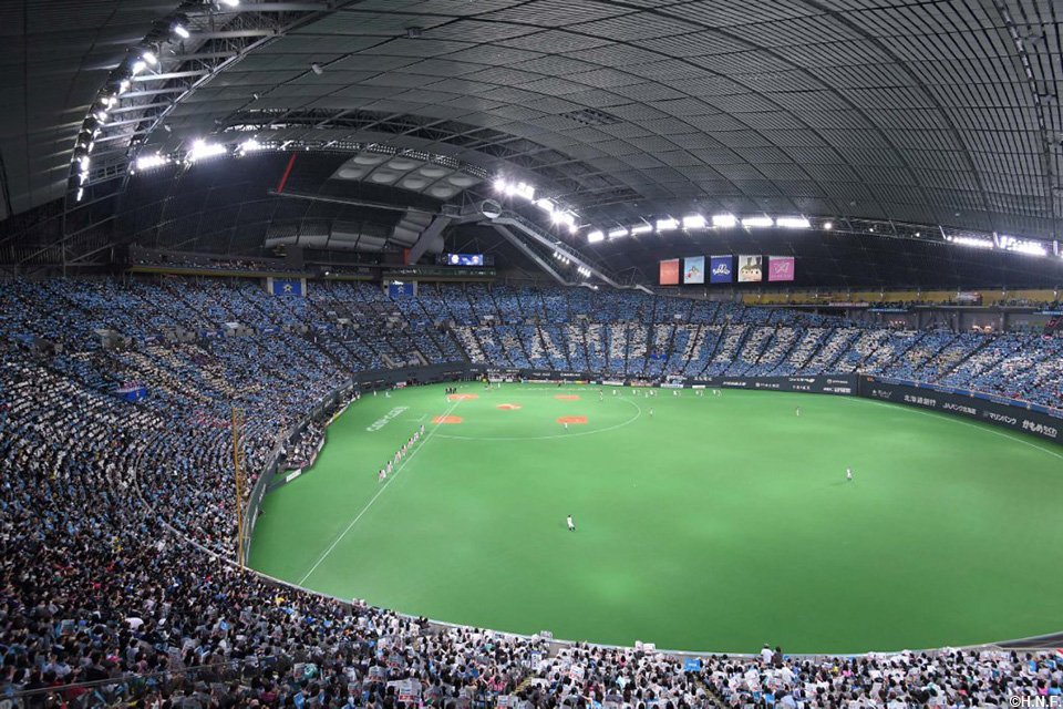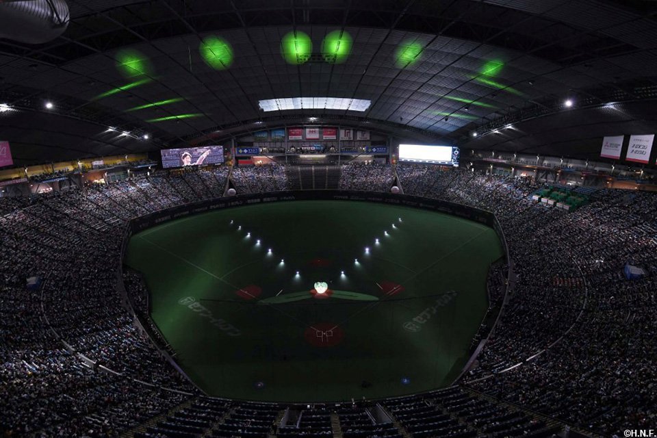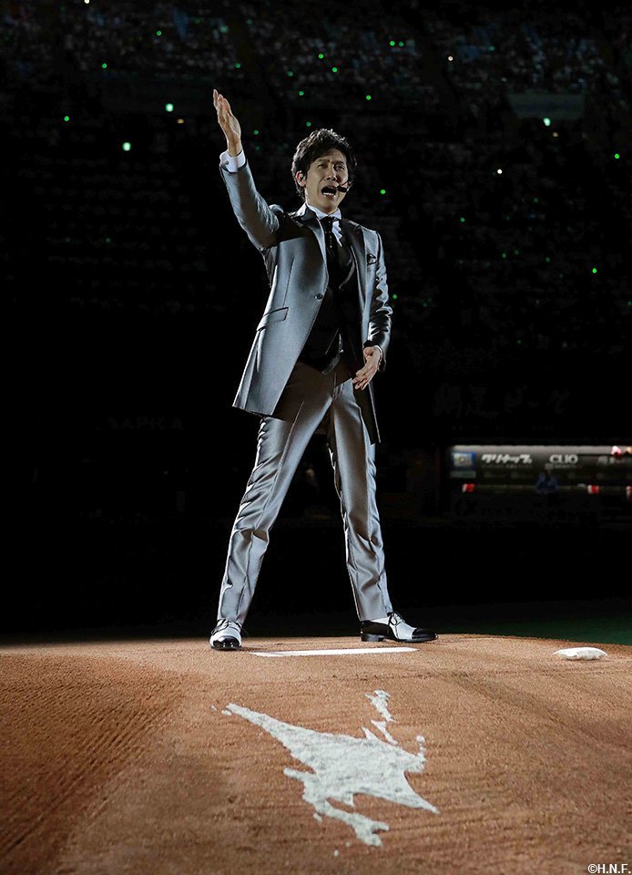 開幕セレモニーでは大泉さんが船長役として登場し、札幌ドームで行われる主催試合の演出テーマ「FIGHTERS GALAXY BASEBALL」に基づいて’宇宙一のその先へ’をイメージした映像を大型ビジョンと天井で上映。続いて監督、コーチ、選手が宇宙空間を思わせる雰囲気の中、一人ひとり紹介され、球団史上初となる2年連続日本一を目指す強い決意に満ちた面持ちでグラウンドに並びました。