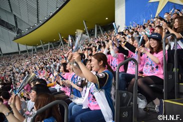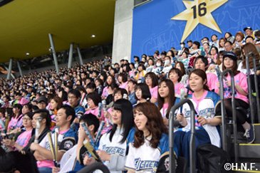 2試合で958組1916名のご応募があり、ご当選された方へ限定品のノベルティTシャツを配布。おそろいの華やかなピンク色がスタンドに映えました。札幌市清田区の花山保育園で園児を預かる中原未玖先生は「昨年初めて球場へ来ましたが、こういう企画があってうれしいです。(年度替わりで)忙しい時期ですが、リフレッシュできました」と声を弾ませていました。