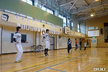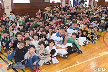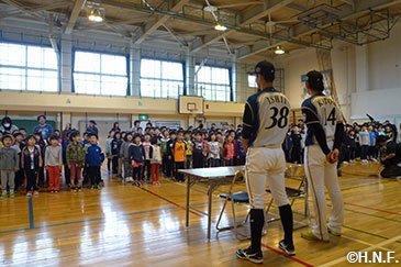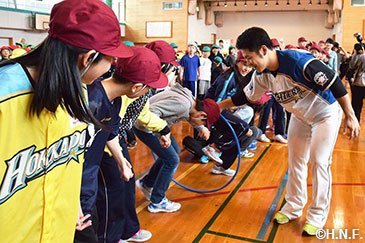 札幌ドームからも車で15分ほどの距離にあり、全校児童270人のほとんどが応援グッズやレプリカユニフォームを着用し、熱烈な歓迎ぶりで近藤健介、石川直也両選手を迎えてくれました。質問を受け付けた後は、2チームに分かれてのフラフープくぐりリレーや児童代表とのキャッチボールで交流を深めました。今年が開校25周年にあたり、近藤選手が「みんなからパワーをもらったので25本塁打を打ちます」と誓えば、石川直選手も「これから巻き返し25ホールドできるよう頑張ります」と約束していました。