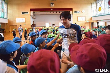 北海道日本ハムファイターズはSC(スポーツ・コミュニティ)活動の一環で子どもたちの夢を育むため、毎年選手による小学校訪問を実施しています。5月11日(木)、明日からの東京ドーム3連戦に向けての移動前に8選手が札幌市内の小学校4校を訪問しました。