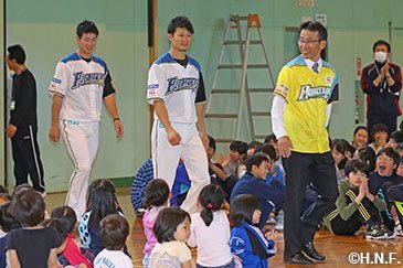 札幌市西区にある琴似小学校を訪問したのは西川遥輝選手と松本剛選手。全校児童450人を前に2人でキャッチボールの実技披露、続いて松本選手がスイングを披露すると、西川選手がマイクを持って解説「松本選手のスイング、すごく速いでしょう。プロ野球選手でも毎日スイングをします。だから皆さんも毎日、勉強を頑張ってください」。体育館は2人が投げるたび、振るたび、話すたびに大歓声です。松本選手は「みんなのたくさんの笑顔で今日は元気をもらいました。皆さんも今日のことを思い出して明日から、勉強に遊びに頑張ってください」と優しい笑顔で話していました。