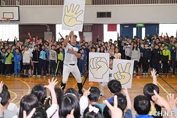 札幌丘珠空港に程近い栄東小学校を大田泰示選手、清水優心選手が訪れると、体育館の扉が開く前から子供たちのカウントダウンが起こるほど、待ちわびてくれていました。キャッチボールの後は、全校児童538人とのジャンケン大会。大きなグー、チョキ、パーのパネルを持った2選手は、フェイントをかけたり息のあったパフォーマンスで、みんな大興奮。大田選手は「ファイターズが本当に地域の皆さんに愛されているのはこういったことを積み重ねてきたからだと実感しました。これからも色々と参加したいです」と、初めての交流を清水選手とともに楽しんでいました。
