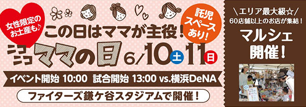 ファイターズ鎌ヶ谷スタジアムでは、6月10日(土)・11日(日)のイースタン・リーグ公式戦(横浜DeNAベイスターズ戦)を、≪ニコニコママの日≫として開催いたします。球場正面広場では、≪鎌スタ☆マルシェ2017≫として全65店舗が出店する他、ライト芝生席後方球場外周路では大好評の<鎌スタ☆ジンギスカンシート>が登場する2日間。マルシェとはフランス語で「市場」という意味。お子様連れでも十分にお楽しみできるこの2日間のチケットは5月20日(土)<ファンクラブ会員は5月19日(金)>発売です。