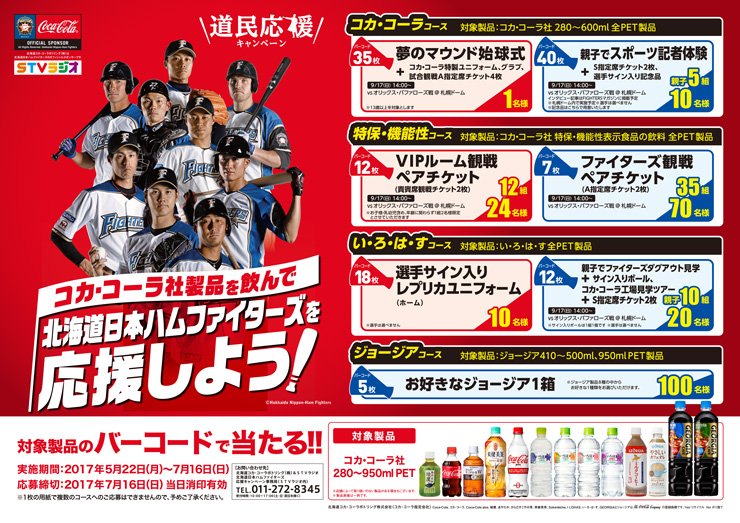 ファイターズオフィシャルスポンサーの北海道コカ・コーラボトリング株式会社では、『コカ・コーラ社製品を飲んで北海道日本ハムファイターズを応援しよう!』キャンペーンを実施中です。コカ・コーラ社対象製品のバーコードを規定枚数集めてご応募いただくと、抽選で素敵なプレゼントが当たるチャンス!9月17日(日)オリックス・バファローズ戦の始球式登板権や、親子でスポーツ記者になって選手にインタビューができる権利、観戦チケットプレゼントのほか、親子で参加するダグアウト&コカ・コーラ工場見学ツアーをご用意しております。詳しくは店頭ポスターや北海道コカ・コーラのホームページをご確認ください。たくさんのご応募をお待ちしております。