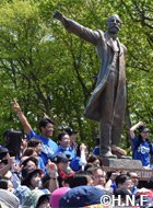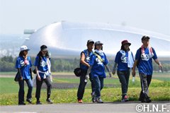 ファイターズダンスアカデミーの田村優佳インストラクター指導によるストレッチで体をほぐした後、気温22度、澄み切った青空の下、おそろいのブルーのTシャツに身を包んだ一団が列をなしていざ出発。風にそよぐポプラ並木や野鳥のさえずりを五感で楽しみながら勾配を上りきると、銀色に輝く大きな札幌ドームの屋根を左手に望みながら折り返し地点の羊ケ丘展望台に到着しました。協賛する北海道コカ・コーラボトリング株式会社提供のドリンクで喉を潤し、羊が草をはむ光景に癒された後は、おなじみクラーク像の前で記念撮影をして再びバファローズ戦が控える札幌ドームへ戻りました。