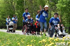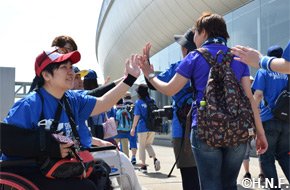 北海道日本ハムファイターズではSC(スポーツ・コミュニティ)活動の一環として、2015年に立ち上げた『ファイターズウォーキングクラブ「FOOTSTEP FUND~あしあと基金~」』の2017年第1回活動を5月20日(土)のオリックス・バファローズ10回戦(札幌ドーム)開始前に実施しました。ファイターズから竹田憲宗代表取締役社長、稲葉篤紀スポーツ・コミュニティ・オフィサー(SCO)が参加し、札幌ドームとさっぽろ羊ケ丘展望台(札幌・豊平区)間の約7キロをウォーキング。北海道内外からご参加いただいた162人の総歩数は179万7990歩にのぼり、10歩1円換算で17万9799円を一般社団法人日本車椅子ソフトボール協会へ寄贈する競技用車椅子の購入費用に積み立てます。