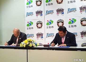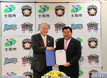 北海道日本ハムファイターズと北海道士別市は5月23日(火)、それぞれが有する資源や特徴ある取組みを有効活用して連携を深めることにより、健康で元気なまちづくりを進めるため、2017年度から2020年度までの3年間に渡るパートナー協定を締結しました。道内ではニセコ町、美唄市、新十津川町、紋別市、足寄町に次ぐ6市町目の協定締結になります。