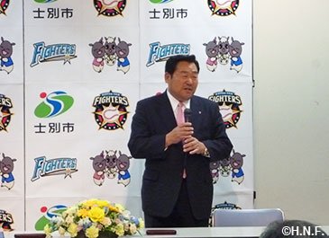 2013年3月にファイターズ士別後援会が発足して以降、同年7月にはイースタン・リーグ公式戦開催、2014年には北海道スマイルキャラバンを開催、そして2015年には市川友也選手と木佐貫洋投手が応援大使に就任するなど、様々な事業を実施してきました。士別市民文化センターで行われた調印式には約80名の市民が出席し、士別市の牧野勇司市長は「待望のパートナー協定を締結できてうれしい限りです。スポーツ・健康都市宣言のまちとして、スポーツ振興と健康増進を球団の力を借りてより一層進めていきたい。」と述べられました。竹田憲宗社長も「士別市が培ってきたこの40年のスポーツの足跡を更に進められるよう協力し、士別市の皆様の心と体の健康づくりにお役に立ちたい。」と話しました。