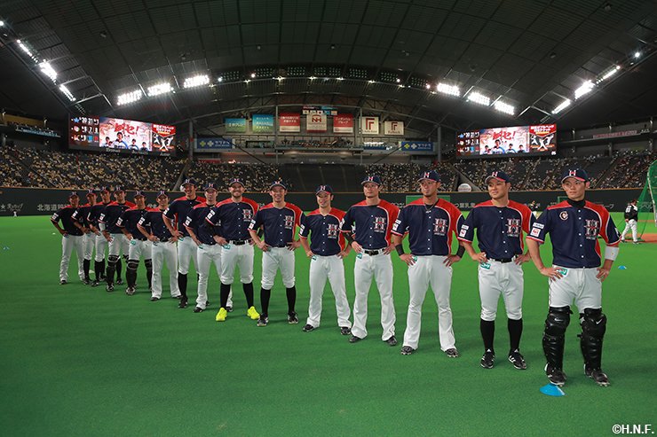 本日の試合前守備練習で限定ユニフォームが披露され、初めて袖を通した大野奨太選手は「いつも以上に北海道のために、北海道民と共に戦うんだという誇りと責任を感じた。チームとしても個人としても大きな志を持ってプレーしたい」と決意を語っていました。