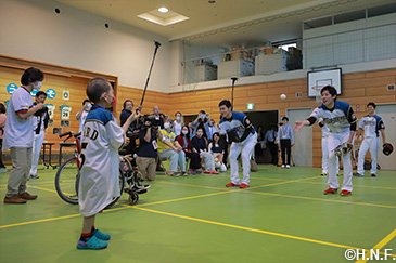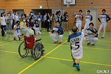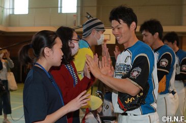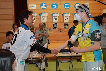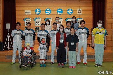 北海道日本ハムファイターズは5月29日(月)、休日を利用して栗山英樹監督と大野奨太選手、増井浩俊投手、鍵谷陽平投手、高梨裕稔投手、渡邉諒選手の6人が北海道大学病院のひまわり分校を訪問しました。病気と闘う子供たちを勇気づけようと、2007年に開始して今年が11回目。病院内の運動療法室で児童・生徒の皆さん5人から質問を受けた後、キャッチボールや記念撮影をして交流を深めました。