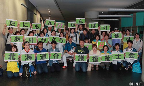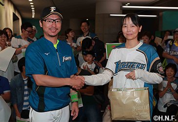 北海道日本ハムファイターズの谷元圭介投手が6月6日(火)広島東洋カープ戦(札幌ドーム)で、今シーズンから実施する社会貢献活動をスタートしました。北海道内の介護福祉士の方々を対象にした「アナたにもんシート」として札幌ドームの試合に1組2名を招待。計35試合で行いますが、初回のこの試合では旭川市、函館市などから22組44名を招きました。活動に賛同していただいた「北海道介護福祉士会」を通じて募集。試合前には招待者と対面して写真撮影で交流し、オリジナルリストバンドも贈呈いたしました。谷元投手は「シーズン中は、なかなか(施設等へ)訪問することはできませんが、オフには微力ながら訪問したりもしたい」と、さらなるバックアップを約束しました。自身の母が介護にあたっており、日々の生活の中で介護福祉士の方々のサポートを受けていることから感謝の思いを込めて実現した活動です。「精一杯、頑張って投げたい」とパフォーマンスへと転化する力にもしていました。