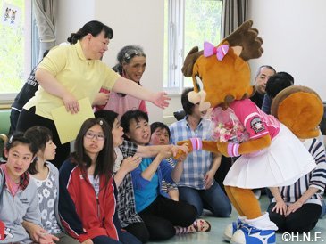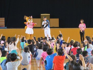 今回のキャラバン初日は、町内の小学校、幼稚園、福祉施設をファイターズベースボールアカデミー池田コーチ、ダンスアカデミー中野インストラクター、マスコットのポリー・フレップが訪問。子供たちも施設の皆様も大興奮で迎えてくださいました。