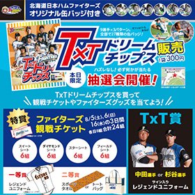 球場内3塁側1Fコンコース北ゲート2前のティーバイティーガレージドリームチップス特設ブースでは、開場から試合終了までファイターズ選手のオリジナル缶バッジつきの「ティーバイティードリームチップス」の特別販売を行います。特設ブースでチップスを購入すると、オリジナル缶バッジがもらえる他、オリジナルコラボグッズや、8月の公式戦のスイートシートチケット、中田選手・杉谷選手の直筆サイン入りユニフォームなどが抽選で当たるクジにその場でチャレンジ!!北ゲート2前のティーバイティーガレージドリームチップス特設ブースにぜひお立寄りください。ティーバイティードリームチップスを食べてファイターズを応援しよう!