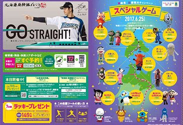 北海道新幹線停車駅等のキャラクターを掲載したストラックアウトです。参加者全員に「北海道新幹線×北海道日本ハムファイターズクリアファイル」をプレゼント。さらに3球中、1枚でも抜いた方の中から抽選で各地域のオリジナルグッズや北海道新幹線グッズをプレゼント。