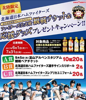 ポッカサッポロフード&ビバレッジ株式会社では、7月31日(月)までの間、北陸限定<ファイターズ公式戦観戦チケット&応援グッズプレゼントキャンペーン!!>を実施しています。期間中、対象商品の北陸&北海道素材無糖茶のバーコードを集めて、4枚1口でご応募いただくと、9月5日(火)に冨山アルペンスタジアムで開催の公式戦ペアチケットなどが抽選で当たります。詳しくは店頭ポスターやポッカサッポロフード&ビバレッジ株式会社のホームページをご覧ください。