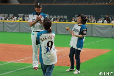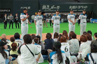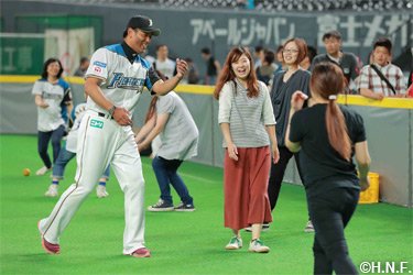 一昨年10月に稲葉SCOが札幌市内の幼稚園を訪問した際、園児たちが楽しくスポーツに親しむのはもちろんのこと、成長に大きな影響を及ぼす保育士の方々に運動習慣の大切さを知っていただくことが重要、と実感したことからプログラムの企画に至りました。実施にあたり、事前に札幌市私立保育園連盟加盟の全施設に案内を流し、6月の札幌ドームでのファイターズ主催試合に1,205名をご招待。その内の150名にこの日のグラウンドイベントにご参加いただきました。