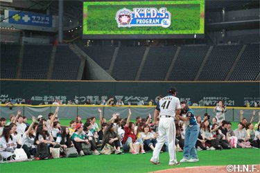 北海道日本ハムファイターズは稲葉篤紀スポーツ・コミュニティ・オフィサー(SCO)が昨年4月に立ち上げた「K.I.D.S.プログラム」の第3回活動を、6月25日(日)、札幌ドームで行われた東北楽天ゴールデンイーグルス10回戦終了後に開催しました。「K.I.D.S.プログラム」とは、子どもの体力低下という社会的課題解決に向けて「“こども”の“育成”のために“道産子”みんなで“スポーツ”に親しみ、触れる環境を作っていこう」という主旨の頭文字を取って命名したものです。昨年4月と9月に引き続き、この日も試合後の札幌ドームに札幌市内の保育園や認定こども園40か所から保育士の方を招き、稲葉SCOとベースボールアカデミー講師陣がウレタンボールを使った運動や遊びを紹介しました。