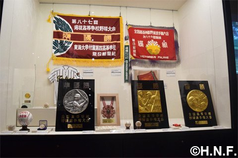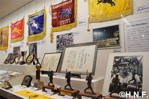 会場では夏の全国選手権で優勝した駒大苫小牧高や、昨年夏に準優勝した北海高の盾を展示しているほか、クラブチームとして日本最古の歴史を持つ函館太洋倶楽部を紹介するコーナー、ベーブ・ルース来日時の写真など貴重な品々が所狭しと飾られています。9月24日(日)までの期間中、ファイターズOBの岩本勉氏の講演、B・Bやポリーとの交流会なども予定されていますので、ぜひこの機会に北海道博物館へ足をお運びください。