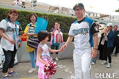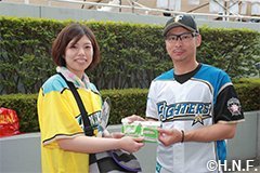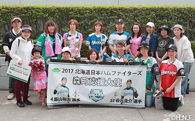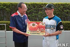 北海道日本ハムファイターズの谷元圭介投手が7月18日(火)の東北楽天ゴールデンイーグルス戦(函館)で、今シーズンから実施している社会貢献活動「アナたにもんシート」の一環の企画を行いました。今シーズンは「北海道179市町村応援大使」を森町で務めています。この日の開催地の函館市にほど近いことから「アナたにもんシート」の対象の介護福祉士の方々ら約40人を、同町から招待しました。6月から札幌ドームの主催試合で1試合2名ずつ、介護福祉士を招待していますが、今回は縁ができた森町にも同様のサポートをしたいとの意向から1試合限定で実施しました。森町の梶谷恵造町長が、招待者と同行。谷元選手と、この日は不在だったもう1人の応援大使の飯山裕志選手へ、名産品のトマトをプレゼントしました。同町長からは「今年は、うれしい結果になってほしいです」と、激励の言葉もいただきました。