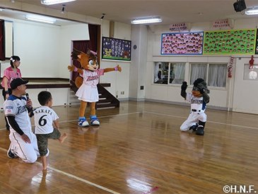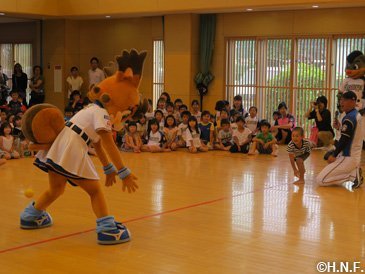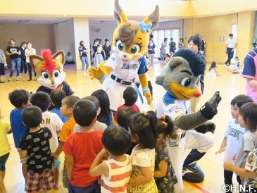 芽室キャラバンには、ファイターズベースボールアカデミー高口コーチ、ダンスアカデミー松田インストラクター、B・B、ポリー、フレップが訪問。雨上がりのじっとりとまとわりつくような湿度が会場中を覆いましたが、開場前から300名が並ぶ大盛況。芽室町のお祭り『めむろ夏フェス2017』との同時開催ということもあり、ゆかた姿の方も大勢来場してくださいました。ステージイベント最後の大抽選会まで、人の波が途絶えることなく、笑顔があふれた交流となりました。