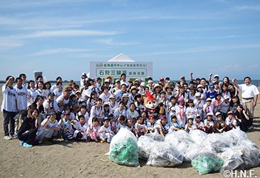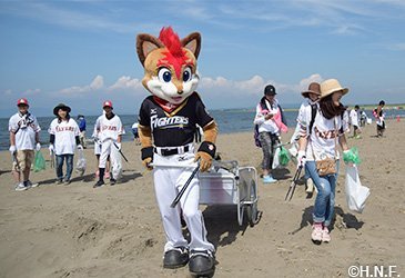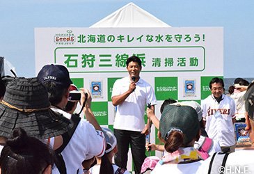 ホクレン農業協同組合連合会と北海道日本ハムファイターズは8月2日(水)、「ホクレン×ファイターズ キープ!クリーンウォーターエコプロジェクト」のテーマである“キレイな水を守る”取り組みとして、石狩市にある石狩三線浜の清掃活動を行いました。2010年にスタートしたこの事業は、「頑張れファイターズ!!無洗米ななつぼし・ほしのゆめ」の売上金の一部(売上1kg当り1円)を環境保全の活動費用に活用。8回目の今回は一般参加者、ホクレンおよび稲葉篤紀スポーツ・コミュニティ・オフィサー(SCO)ら球団関係者含め総勢約100名が集まり、約1時間かけて海岸の清掃活動に励みました。