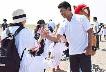 清掃開始を前に、ホクレン農業協同組合連合会の穴田繁俊米穀事業本部長からご挨拶をいただき、石狩市環境市民部ごみ・リサイクル課の伊藤英司課長からは注意事項に関するご説明がありました。ファイターズからは今回で3年連続の参加になる稲葉SCOがステージに上がり、「きれいな水が大地の恵みを育み、僕たちはそれを食べて元気に過ごさせてもらっています。この浜をきれいにして美しい北海道を残していきましょう」とスピーチし、清掃活動に向かう全員をハイタッチで送り出しました。