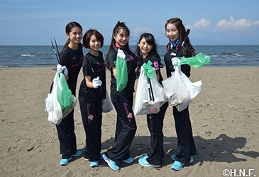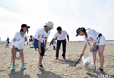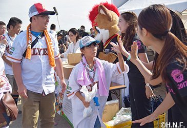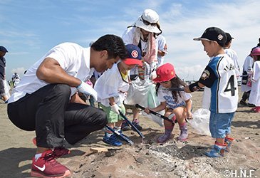 清掃エリアは全長1キロにおよび、中間地点で2班に分かれて作業を開始。会場で配布した「レジェンドシリーズ 2017」のレプリカユニフォームを身にまとった参加者が砂浜に散らばり、花火やバーベキューをしてそのまま残された屑や、瓶・缶などを分別しながら回収していきました。砂の下に埋まったガラスの欠片なども多く、安全に海水浴が楽しめるよう丁寧に拾い集めていきました。フレップや5人のファイターズガールも積極的に子どもたちと触れ合い、潮風と夏の日差しを感じながら作業を進めていきました。