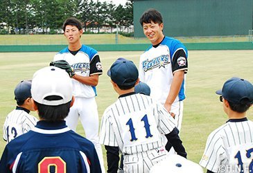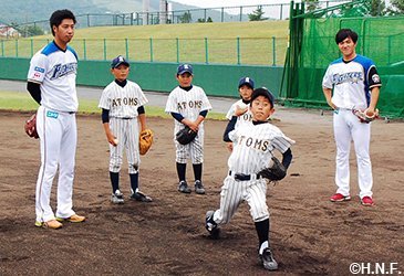 「潮見アトムズ」の捕手の近藤弥洋(みなみ)主将(潮見小6年)は「清水選手、郡選手は体が大きくてカッコ良かった。キャッチャーフライの追い方とか勉強になりました」と、目を輝かせていました。「紋別オホーツクイーグルス」の投手兼遊撃手の茂木亜智(あさと)主将(紋別小6年)も「吉田選手から、投手として投げる時には体を捕手の方へ持っていくようにすることを教えてもらいました。参考にしたいです」と、体重移動のレクチャーから上達のヒントをつかんでいました。