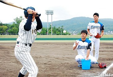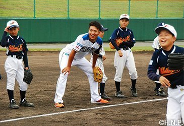 明るいキャラクターのルーキー郡捕手が先導して号令をかけてウオーミングアップ、キャッチボールを行った後は、グラウンドいっぱいを使って打撃練習のロングティーを実施しました。その後は、ポジション別に分かれてのレクチャー。郡選手は「新鮮でした。自分は子供のころにこういう経験ができなかった。こういうイベントに、どんどん参加していきたいです」と、プロで初体験となった講師役に刺激を受けていました。