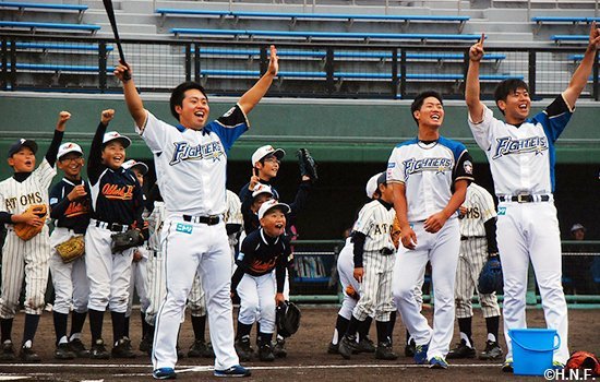 野球教室のクライマックスでは、長距離砲として期待の新人の今井選手の模範演技に大歓声が起きました。ロングティーで、ホームランを連発。最高の盛り上がりで、ファイターズの選手にとっても、少年少女球児にとっても、かけがえのない時間を締めくくりました。