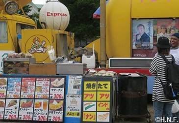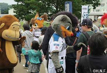 連日開場前から大行列ができ、開場と同時にキャラバン初参加のベースボールアカデミー村田コーチ、ダンスアカデミー田村インストラクター、B・B、ポリー、フレップ、ファイターズガールの周りでは撮影会がとまりません。盆踊りにも参加し、ポリー・フレップはやぐらで太鼓を叩き、B・Bも盆踊りと、夏祭りらしいキャラバンとなりました。