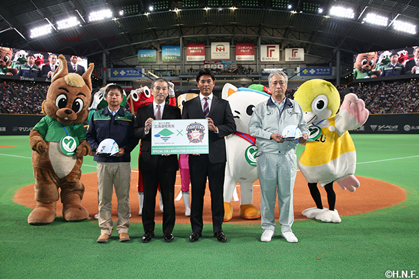2016年8月30日に北海道全域に大きな被害を及ぼした台風10号の影響により被災し、土砂流入、路面崩壊、落橋などの甚大な被害を受けた日高と十勝を結ぶ大動脈、国道274号の日勝峠は北海道開発局が先頭に立ち、1日も早い復旧に向けて工事を続けてきました。北海道日本ハムファイターズも復興へ向けて台風災害義援金を募り、見舞金を贈呈させていただくなど陰ながら支援してきました。被災から一年を迎え、日勝峠の復旧にもメドが立ったことを受け、最前線での北海道開発局の尽力に敬意を表し、災害からの復興への取り組みの映像を試合前に大型ビジョンにて放映いたしました。また復旧工事に携わった工事関係者の方々を招き、ヘルメットを贈呈させていただきました。