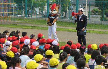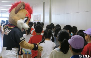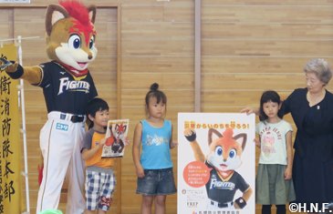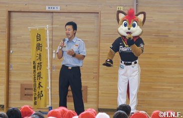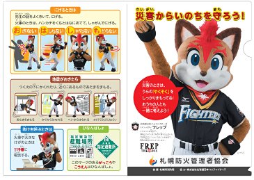 本日8月23日(水)、札幌市立北白石小学校で防火・防災啓蒙活動の一環として、非難時の注意事項「お・は・し・も」の説明が明記されたクリアファイルの贈呈式が行われ、メーンキャラクターを務めるファイターズのマスコット“フレップ”も参加しました。札幌防火管理者協会が札幌市内の小学生を対象に実施しているもので、札幌市内の小学1年生・約15,000人に配布されます。