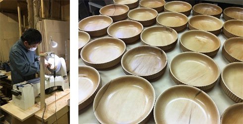 真冬の森で伐採された丸太は、製材所へ運ばれ、スライスされて板になり、釜へ入れられて人工乾燥にかけられます。それからチエモク株式会社へ運ばれ、板を回転させる旋盤という機械を使って手削りし、皿へと形を変えていきます。その後、撥水性・防汚性に優れたガラス仕上げという6回もの塗装工程を経て、完成となります。
