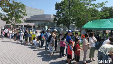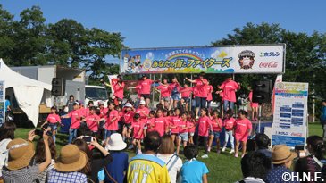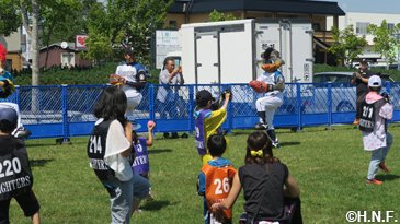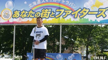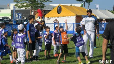 例年この時期の気温は20度前後と涼しいそうですが、訪問初日は29度を超え、“しるべっと広場”で開催した二・三日目の交流イベントも朝から快晴。蒸し暑い中、開場前から多くの方が並んでくださいました。オープニングでは西村穣中標津町長が「2013年は応援大使、今年はスマイルキャラバンと、色々なイベントで盛り上げてくれて、北海道のファイターズだと感じています」と挨拶されると、会場の皆さんからも拍手が起こりました。
