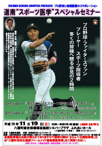 北海道・八雲総合病院主催の講演会「道南“スポーツ医学”スペシャルセミナー」が、11月19日(日)に八雲町内で開催されます。北海道日本ハムファイターズの田中賢介選手とチームドクターの横田正司医師(八雲総合病院整形外科・医長)が医療とスポーツをテーマに講演します。入場無料、事前申込は不要となっておりますが、定員600人につき満席の場合はご入場をお断りする場合もございます。予めご了承ください。