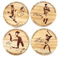 国産杉の間伐材を使用し、選手シルエットを焼印風にあしらったコースターはインテリアにも使えるアイテム。