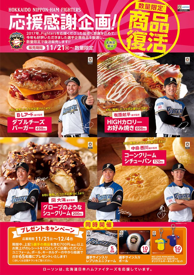 ファイターズオフィシャルスポンサー・ローソンでは、今年もご好評いただいた選手企画商品を11月21日(火)から数量限定で復活しています。皆様へ感謝の気持ちを込めて、グッズが当たるキャンペーンも12月4日(月)まで同時開催です。