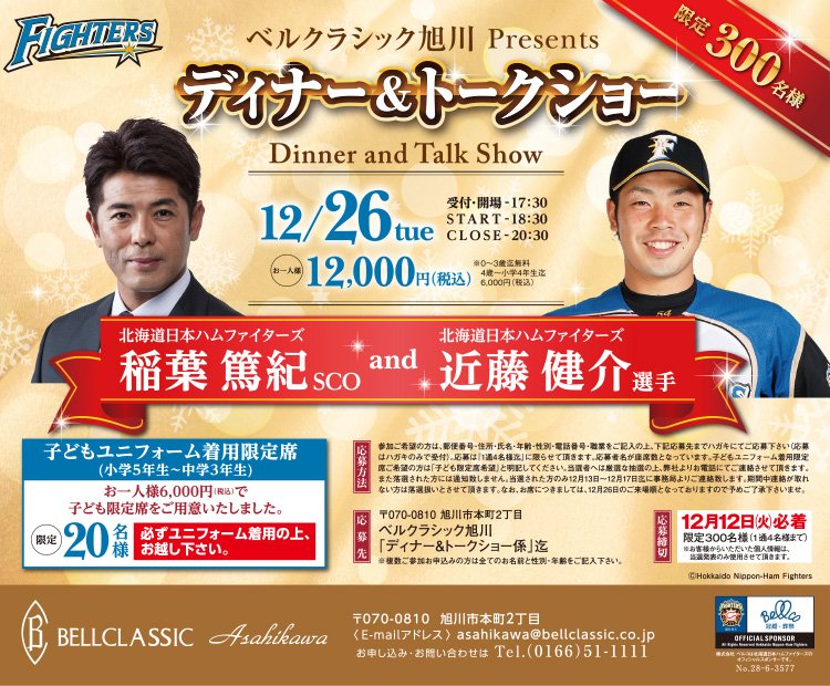 ファイターズオフィシャルスポンサー・株式会社ベルコではこの度、アール・ベル・アンジェとベルクラシックの各結婚式場にファイターズの選手、稲葉SCO、飯山コーチを迎えてディナー&トークショーを開催いたします。