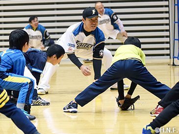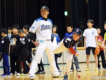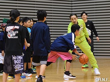 野球は相撲の股割りを応用して腰を落とした捕球体勢を覚えこませ、ゴロを捕って狙った的に当てるという一連の動作を反復しました。低い姿勢で瞬時の動きに入るのは3競技の共通点。トークショーで両親がバスケットボール選手だったというエピソードを明かした黒羽根選手は「子どものころは枠にとらわれず様々なスポーツに取り組むことも大事で、今日教わったことをぜひ継続してほしい。今後もプロチーム合同でこういう機会を増やしていけたら」と話していました。