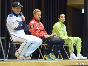12月10日(日)に釧路市の「湿原の森アリーナ釧路」で開催された「スポーツの楽しさを学ぼう ジュニアスポーツチャレンジ!」に、北海道日本ハムファイターズの黒羽根利規選手が北海道コンサドーレ札幌の福森晃斗選手、レバンガ北海道の牧全選手とともに参加しました。スポンサーとして3チームを応援するサッポロビール株式会社北海道本社、日本航空株式会社北海道地区、株式会社北海道新聞社が連携して初めて開催した合同スポーツ教室で、この6社がいずれもパートナー企業として参画する「北海道150年事業」の一環で実施されました。