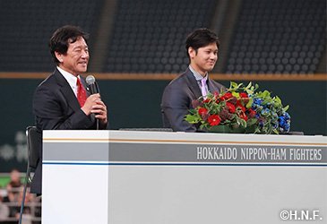 花巻東高時代から親交が深かった長嶋三奈さんのナレーションで、大型ビジョンで思い出の映像を振り返り、栗山監督ととも球場へ姿を現して記者会見がスタートしました。