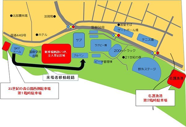 2月1日(木)より沖縄県国頭村にて行われる春季キャンプ期間中の「かいぎんフィールド国頭」、および2月17日(土)より沖縄県名護市にて行われる春季キャンプ期間中の「21世紀の森公園」(あけみおSKYドーム、ブルペン)へのアクセスについてお知らせいたします。春季キャンプ期間中(2月1日(木)~2月23日(金))は、近隣の周辺駐車場の野球観戦利用(ファイターズ春季キャンプ見学)はできませんので、臨時・特設駐車場をご利用ください。なお、シャトルバスの運行はございませんので予めご了承下さい。